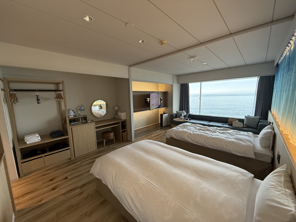 部屋はオーシャンビューで、広めの部屋。綺麗だし、ゆったり過ごせるし、テレビは大きめで、自由が高かったのでとても良かった。夜朝2食+オールインクルーシブル(夜間早朝を除く)2人で43200円ということで、とてもいい感じだった。これより安い部屋はあるので、それでも十分だと思う。